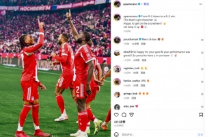 于帕社媒晒庆祝照:6球逆转证明了拜仁的韧性 很高兴打开进球账户